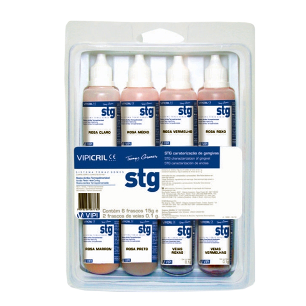 O Kit STG é um conjunto completo de resinas termopolimerizáveis para caracterização de gengivas em próteses dentárias. Desenvolvido para reproduzir com precisão a coloração e textura das gengivas naturais, garantindo acabamento realista e durabilidade. Ideal para laboratórios odontológicos, protéticos e técnicos que buscam alta fidelidade estética.
